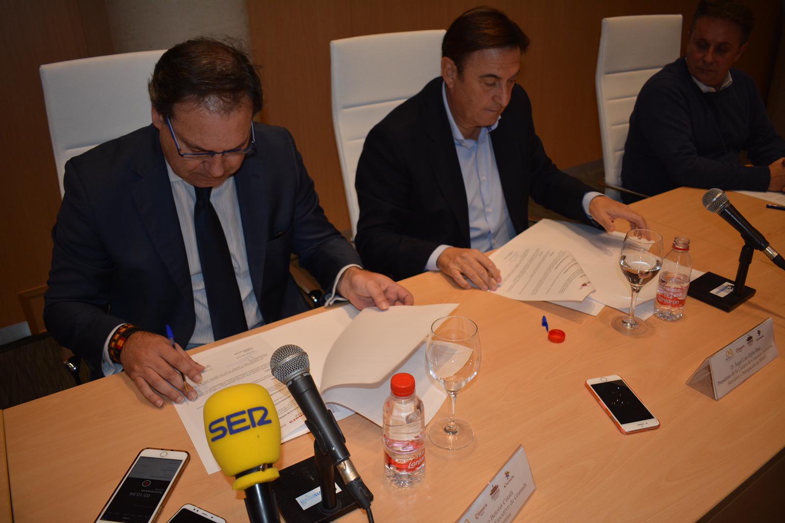 El presidente de la Cámara de Comercio de Motril, Ángel Gijón, ha firmado esta mañana un convenio de colaboración con Granada Convention Bureau con el objetivo de integrarse en su comité ejecutivo. Junto a él, el presidente del comité ejecutivo de Granada Convention Bureau, Trinitario Betoret, ha sellado está unión que supondrá un impulso turístico y comercial para Granada y su provincia.