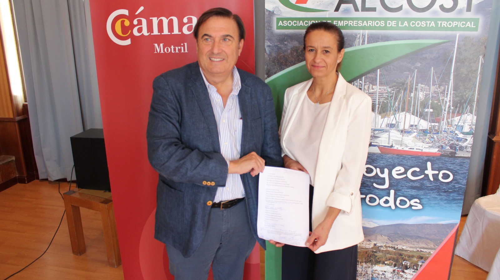 El entorno elegido para la firma de este acuerdo ha sido el salón de actos del Edificio Azul del Puerto de Motril, donde se han reunido representantes de las principales asociaciones de la ciudad, además de prensa.